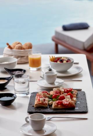 Taking into consideration that Mykonos is an island that never sleeps, we are well aware that our guests’ eating schedule can become erratic. Thus it is pointless to contain meal serving etiquettes in specific time periods without offering the option of having a meal later or earlier than expected. Our Room Service menu is available throughout the day, from early in the morning till late at night, bringing you at the comfort and privacy of your suite a delicious range of culinary options. • Serving Hours: 08:00 - 23:00